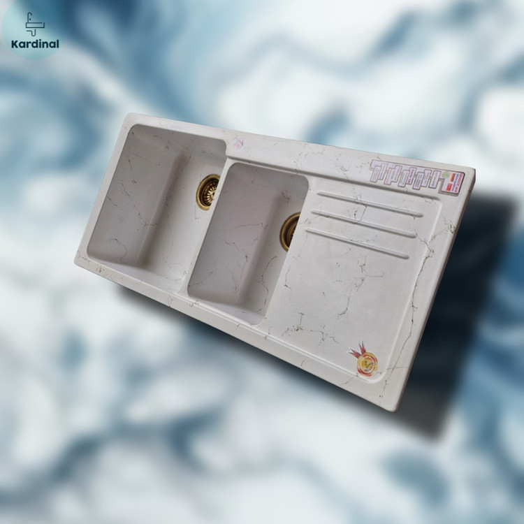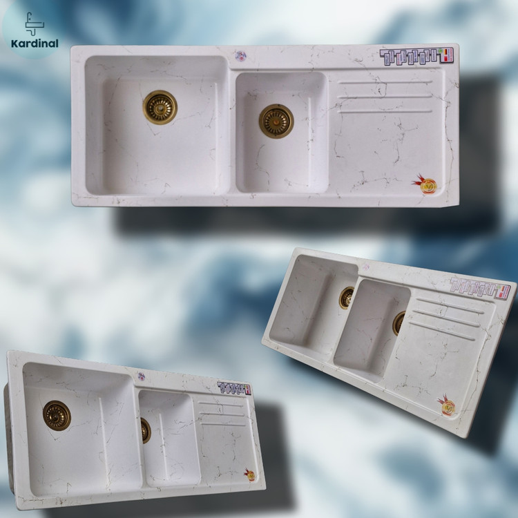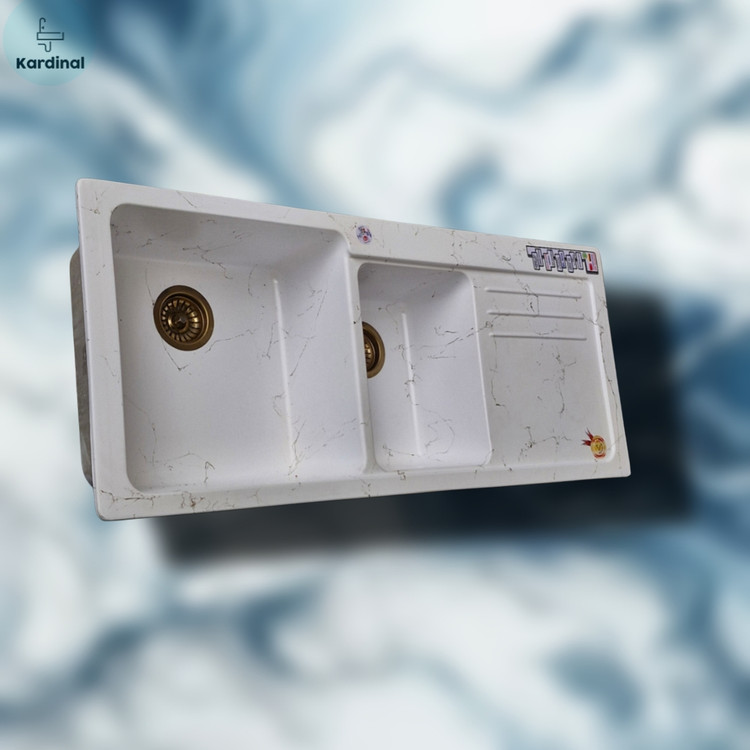 این سینک با طراحی دو لگنه نامتقارن، یکی بزرگتر و دیگری کوچکتر، برای استفاده همزمان در شستوشوی میوه، سبزیجات یا ظروف بسیار کاربردی است. رنگ مشکی با رگههای مرمری طلایی، جلوهای لوکس و چشمنواز به آشپزخانه میدهد.